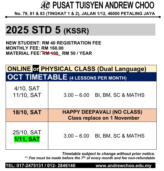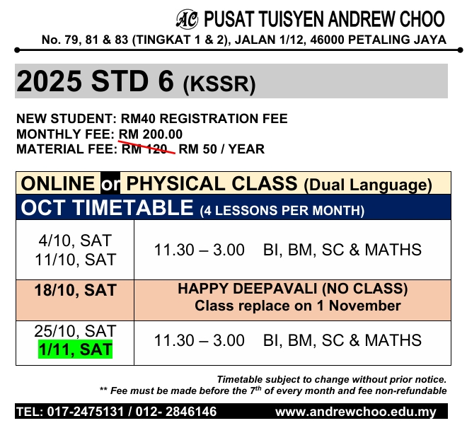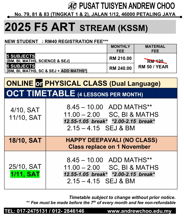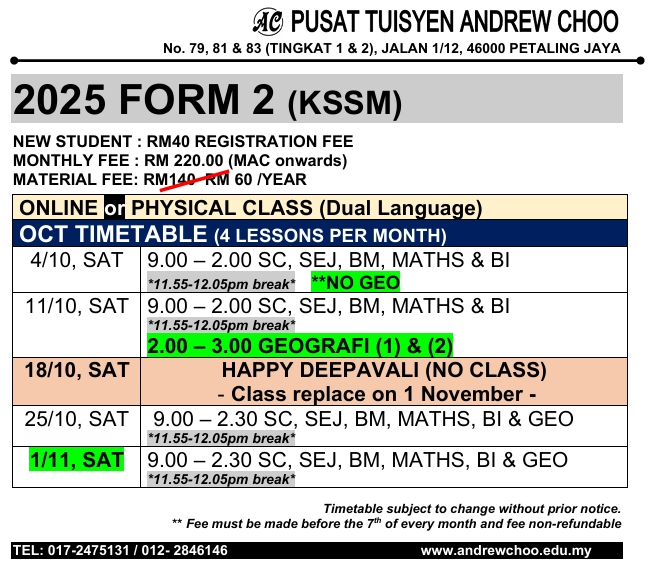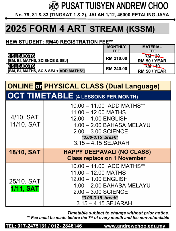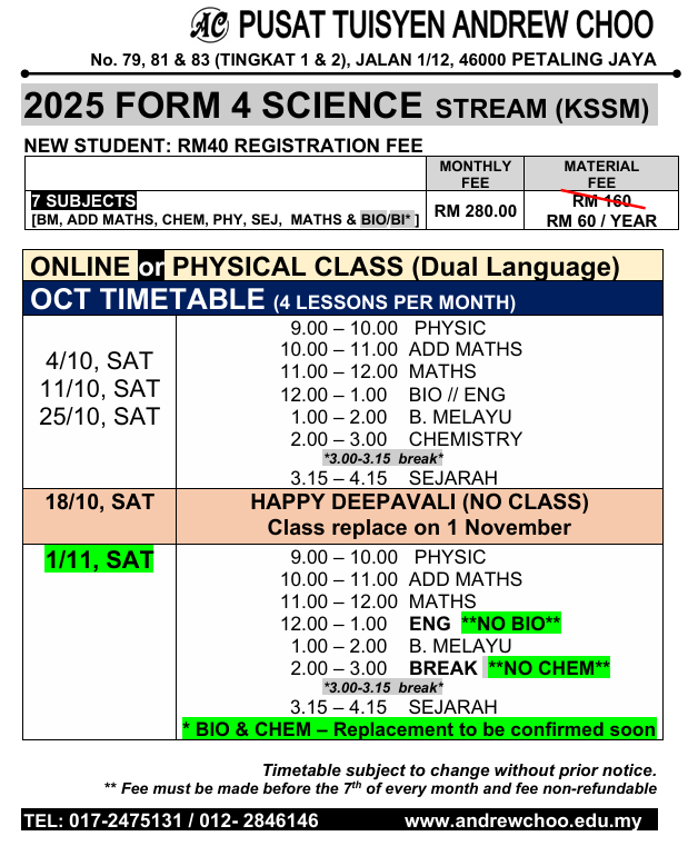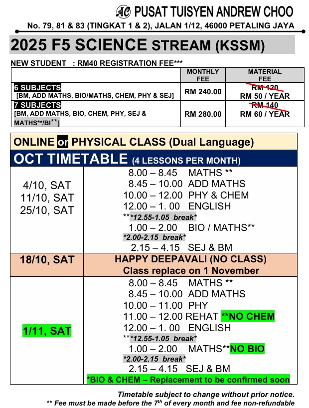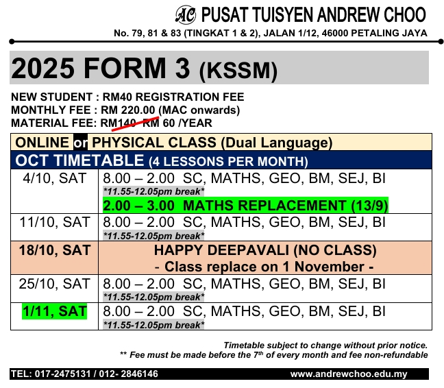 2025 OCT TUITION TIMETABLE (ONLINE // PHYSICAL CLASS // KELAS BERSEMUKA)