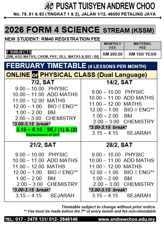 2026 FEB TUITION TIMETABLE (ONLINE // PHYSICAL CLASS // KELAS BERSEMUKA)