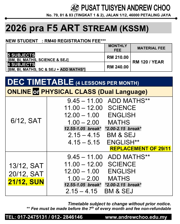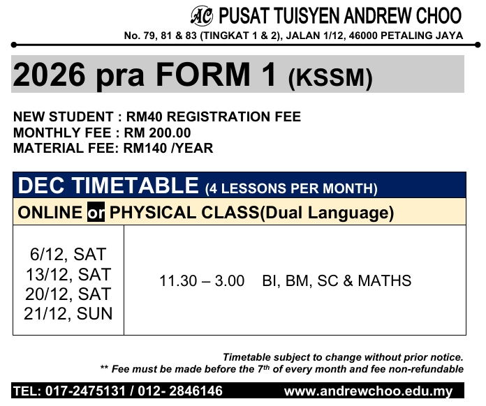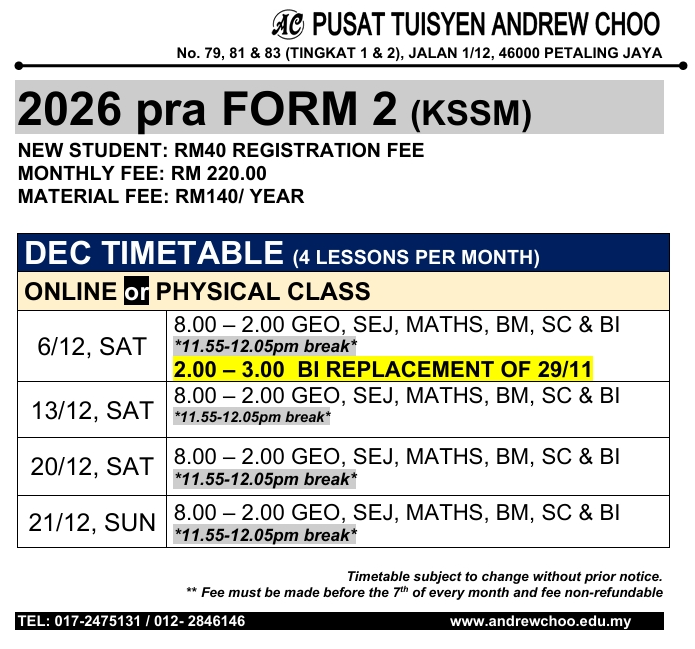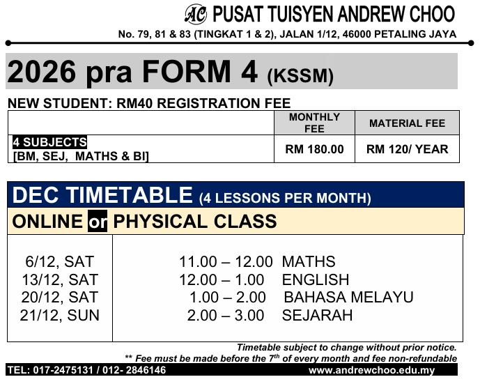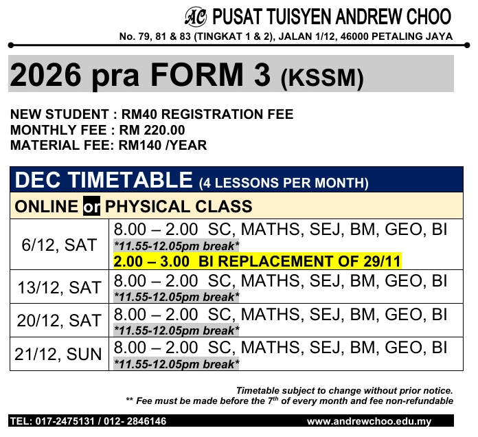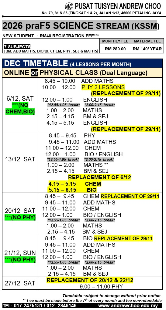 2026 DEC TUITION TIMETABLE (ONLINE // PHYSICAL CLASS // KELAS BERSEMUKA)